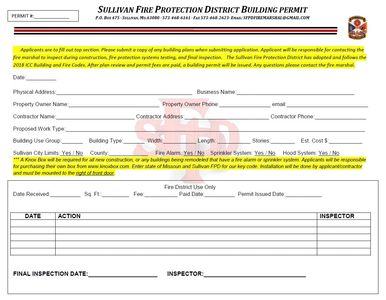 The Sullivan Fire Protection District requires a building permit for all commercial construction. This includes new construction, remodel, and additions. Please click on the link and fill out a building permit application. You can email your application or drop it off at the office. Two Sets of plans are required. One set of electronic and one set of paper copies of the plans are required to accompany the building permit application. Fees are due before a permit will be issued. Any Questions feel free to contact the Fire marshal at sfpdfiremarshal@gmail.com or call the office at 573-468-6161.